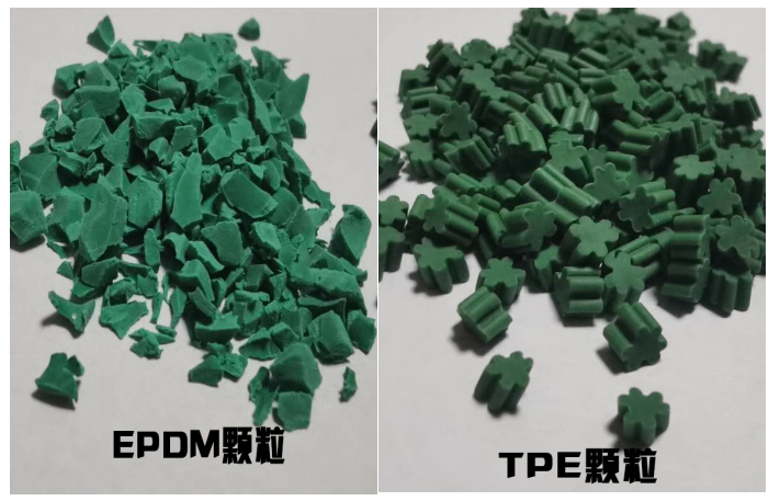 “EPDM顆?!敝饕煞质侨冶z,經(jīng)過高溫硫化制得,“TPE顆?!庇址Q熱塑性彈性體,可稱為人造橡膠。兩者從形狀上面有著較大差異,“EPDM顆?!背尸F(xiàn)出不規(guī)則形狀、不同大小的顆粒,而“TPE顆?!钡耐庑魏统叽缍际忠恢隆?/strong>
